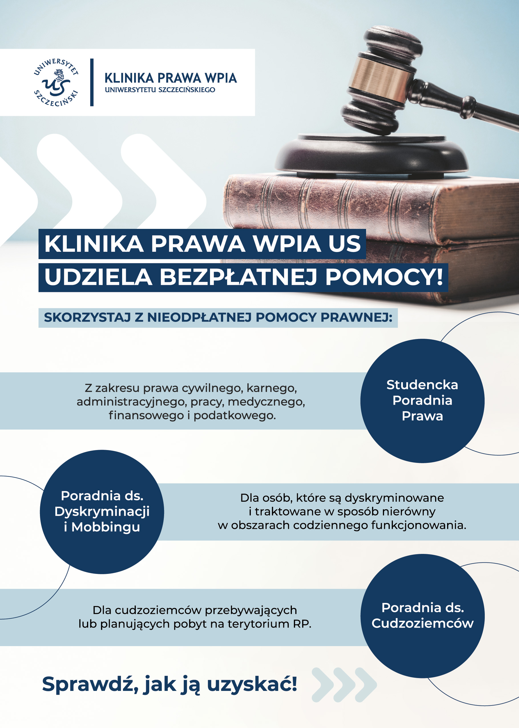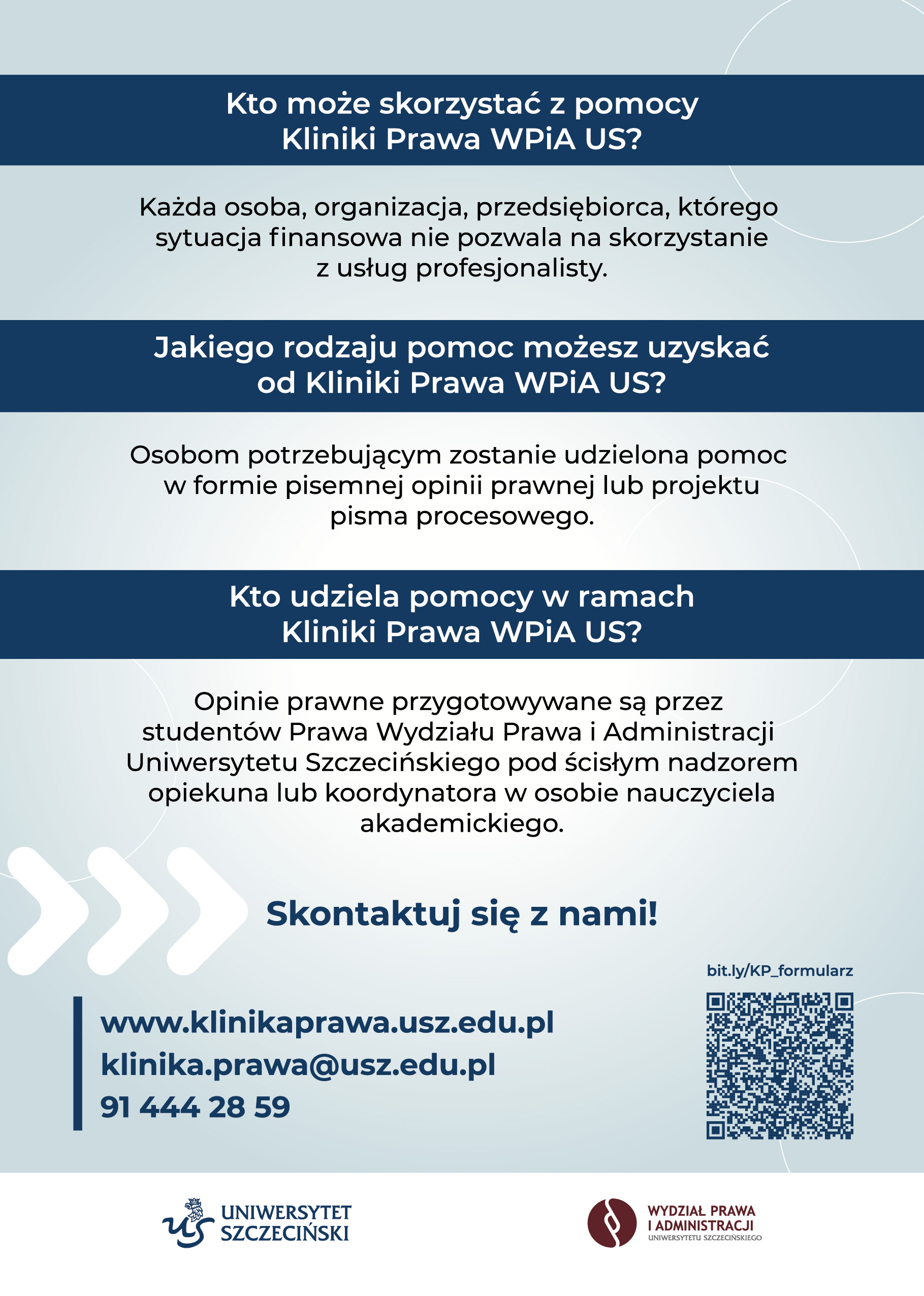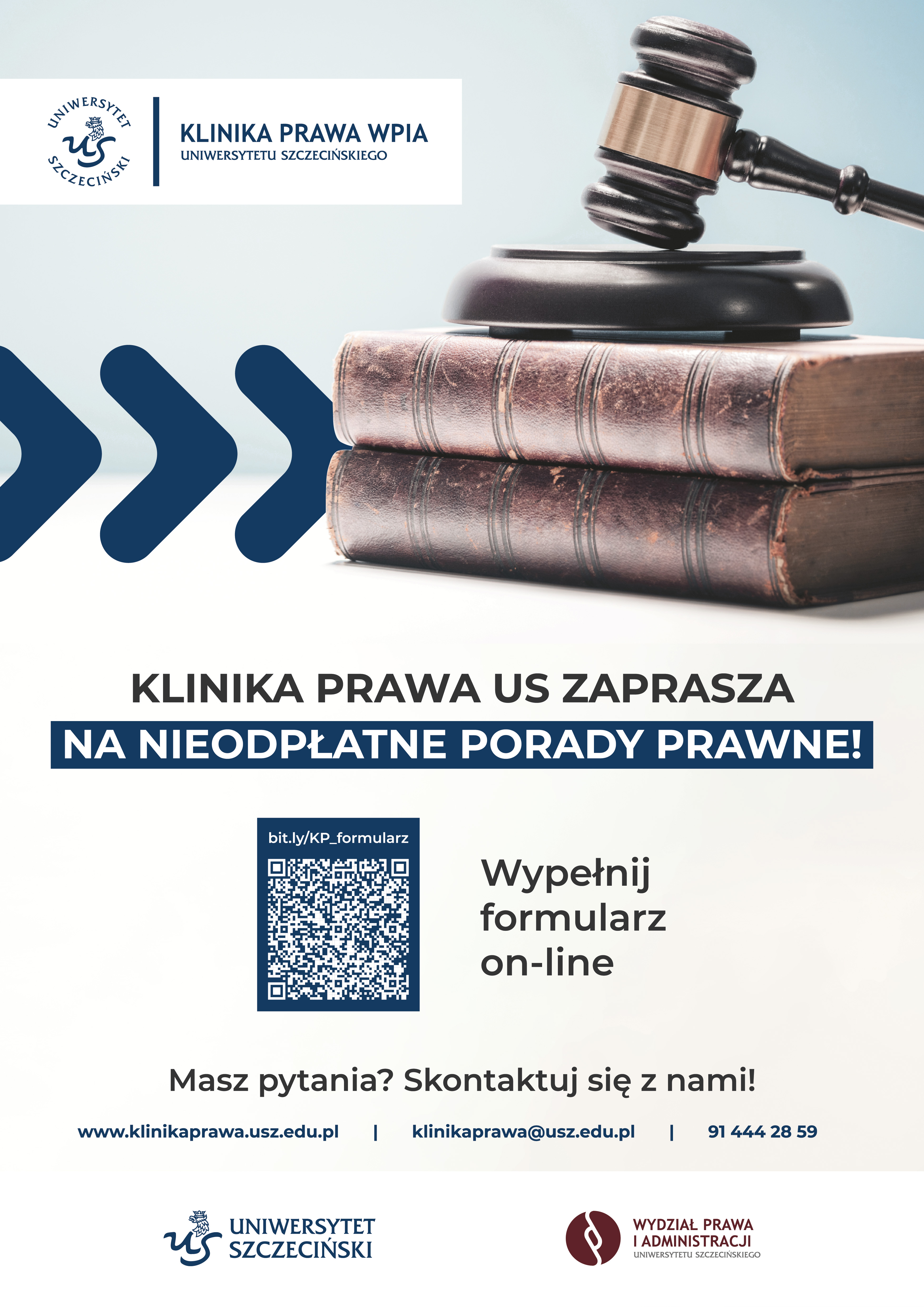 Uprzejmie informujemy, że na Wydziale Prawa i Administracji Uniwersytetu Szczecińskiego funkcjonuje Klinika Prawa WPiA US, której celem jest udzielenie przez studentów nieodpłatnej pomocy prawnej osobom, których sytuacja finansowa nie pozwala na korzystanie z odpłatnego wsparcia osób wykonujących zawody prawnicze.